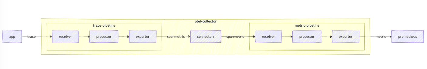 # example :: otel-collector config connectors: spanmetrics: histogram: explicit: buckets: [5ms, 10ms, 15ms, 30ms, 50ms, 100ms, 300ms, 500ms, 1s] resource_metrics_cache_size: 1000 # default is 1000 metrics_flush_interval : 10s # default is 15s namespace: default resource_metrics_key_attributes: - service.name - telemetry.sdk.language - telemetry.sdk.name # ... service: extensions: [pprof, zpages, health_check, sigv4auth] pipelines: metrics: receivers: [otlp, spanmetrics] processors: [batch] exporters: [otlphttp/prometheus] traces: receivers: [otlp] processors: [batch] exporters: [otlp, spanmetrics]위의 OTel-collector 구성 예시를 살펴보자.