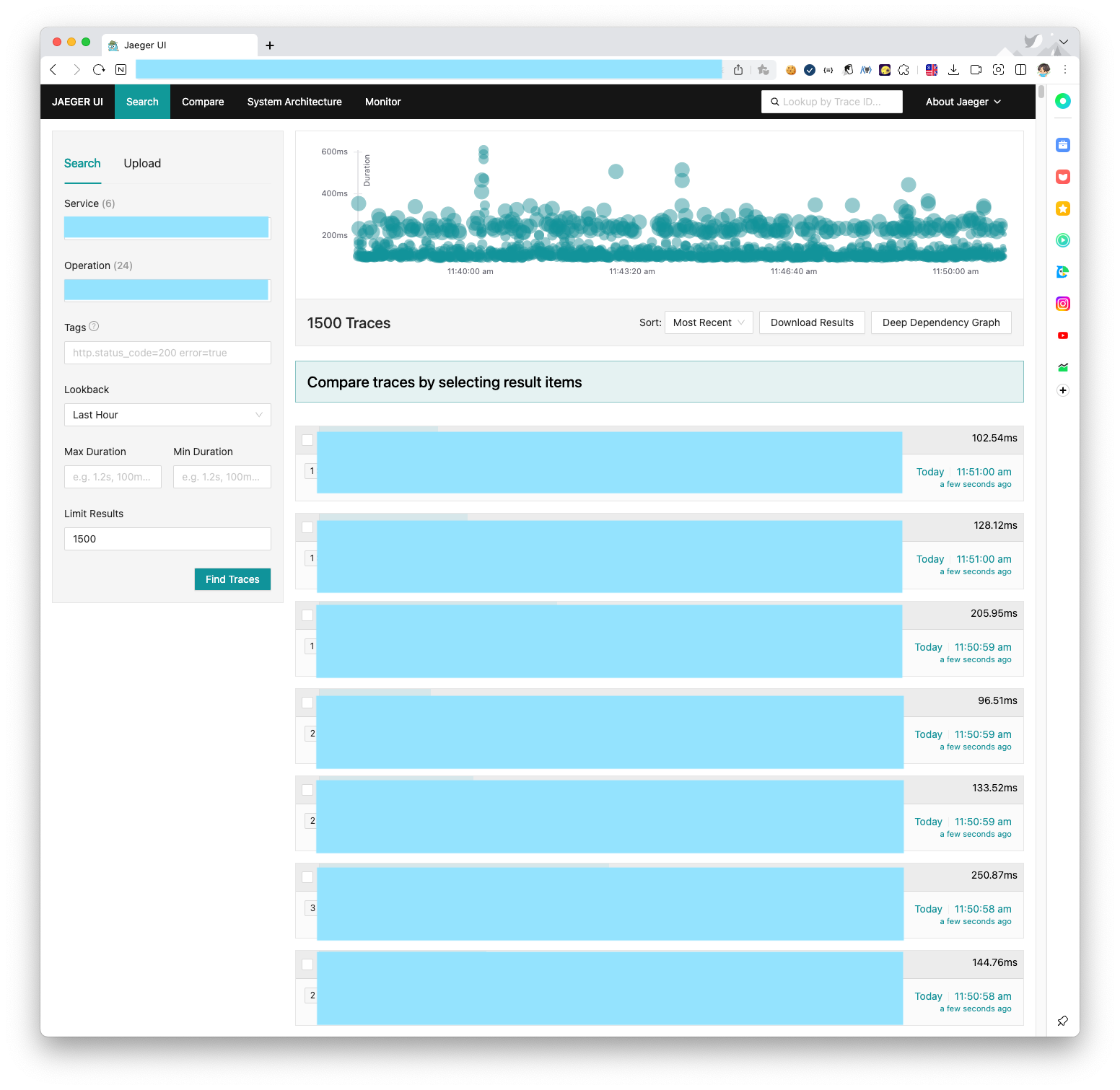 실시간으로 집계되는 데이터를 저장하고 Jaeger-ui를 사용한다면 시각화된 트레이스-스팬과 서비스 현황을 볼 수 있다.